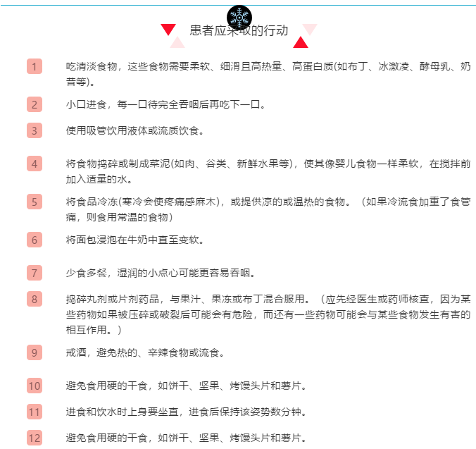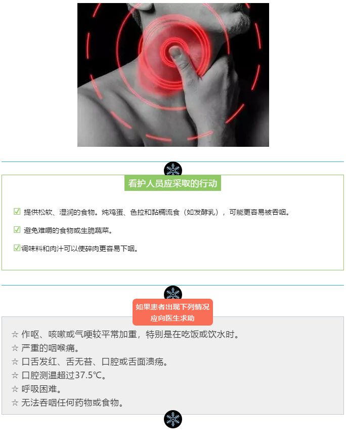 吞咽困難是指患者無法將食物或水通過咽喉下送。當努力吞咽時,患者可能會出現(xiàn)嘔吐、咳嗽、流涎或明顯疼痛感。導致吞咽困難的病因有多種,除針對咽喉或胸部放療和化療所產(chǎn)生的短期不良反應外,口腔感染(如鵝口瘡)或食道感染也是常見病因。