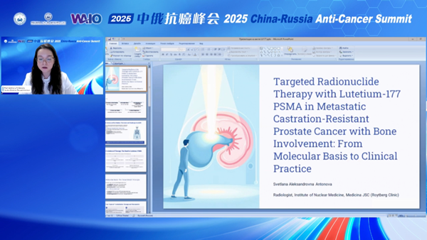俄羅斯科學(xué)院院士、俄羅斯國立N. I. Pirogov醫(yī)科大學(xué)家庭醫(yī)學(xué)系主任、俄羅斯聯(lián)邦功勛醫(yī)生Grigory Roytberg院士的講座報(bào)告為“針對(duì)伴有骨轉(zhuǎn)移的轉(zhuǎn)移性去勢抵抗性前列腺癌的Lutetium-177 PSMA靶向放射性核素治療:從分子基礎(chǔ)到臨床實(shí)踐”。本次講座由核醫(yī)學(xué)研究所醫(yī)生Svetlana Antonova教授進(jìn)行分享,講座中Antonova教授指出,約90%的前列腺癌患者會(huì)發(fā)生骨轉(zhuǎn)移,嚴(yán)重影響生活質(zhì)量,并分享了該領(lǐng)域最新進(jìn)展——Lutetium-177放射性配體療法。該方法針對(duì)前列腺癌骨轉(zhuǎn)移問題,通過嚴(yán)格患者篩選(基于PSMA PET-CT)、療效評(píng)估及毒性管理實(shí)現(xiàn)高效治療。結(jié)果顯示,患者總生存期提升至15.3個(gè)月,死亡風(fēng)險(xiǎn)下降38%,骨痛顯著減輕,且藥物毒性可控。未來,Lutetium-177 有望與免疫治療等聯(lián)合,為前列腺癌患者提供更有效的治療選擇。